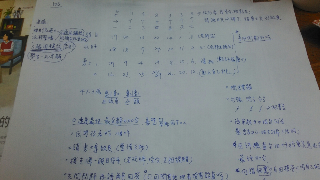 第6節地理入班授課:事前拜託該班地理老師分好組別,主要是看上課的流程,如何讓進度加快,讓學生熟悉老師的指令。對於學習落後的孩子如何透過課程讓他真的可以學會基本知識,確認全班都找到具體答案後,老師開始提問,每次抽籤抽到號碼的那一組,都是由老闆回答問題,一旦老闆學會了,代表全組也都學會了!最後再由老師針對每個主題進行統整,當然課堂是真實的,遇到棘手狀況,老師應該如何引導與排解,再再考驗老師的應變能力。