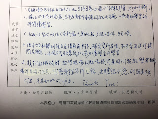 今天的觀課,將為自己的教學帶來極大的正能量,希望自己也能將所見所聞所感受,化成實質的作法、修正自己的教學,再應用於自己的課堂中,嘉惠學生。